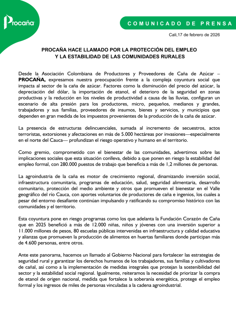 Unidos por la caña: aprendizajes del año y retos 202612 diciembre, 2025Por: Martha Betancourt – Directora Ejecutiva de Procaña Al llegar al final del año, es pertinente hacer un balance de los hechos que marcaron el rumbo de nuestra vida, los logros, las dificultades y aquellos propósitos que quedaron pendientes y que serán la base para la construcción de la hoja de ruta con la que daremos inicio al 2026, el cual presenta grandes retos en lo personal, lo empresarial, lo gremial y lo político que será determinante en el rumbo de nuestro país en los próximos 4 años. La delicada situación de orden público, la violencia generada por los cultivos ilícitos, las violaciones a la propiedad privada, el aumento de los índices de criminalidad, la inestabilidad jurídica, la polarización, la reducción en los indicadores de productividad – especialmente de sacarosa y la caída del precio internacional del azúcar han sido las mayores dificultades en nuestro sector que han requerido acciones extraordinarias y marcan un reto para todos los actores de la cadena. Los indicadores de productividad y pluviometría siguen representando un reto para el sector, en la tabla se observa un incremento en las TCH que pasaron de 114 a 124, el aumento en la edad de corte con cierre a octubre del 2025 determinó que las TCHM estén ligeramente por encima del año 2024, mientras que el rendimiento promedio mantiene su tendencia decreciente cerrando el mes de octubre en 10,2. Fundamental que se mantenga un análisis multifactorial de los aspectos que lo afectan tanto en prácticas agrícolas, cosecha mecanizada y factores de fábrica que permitan implementar acciones de mitigación. Destacamos los logros alcanzados con los programas sociales que avanzan gracias al compromiso de los cultivadores de caña para promover el desarrollo social y económico de las comunidades donde operamos, buscando mejorar la calidad de vida de las personas, contribuyendo con programas para reducir la pobreza, promoviendo la seguridad alimentaria y propendiendo por un entorno más estable para el futuro. Destacamos algunas de ellas: ALDEAS 1.640 Huertas familiares y comunitarias que benefician a 4.630 personas en 8 municipios del Valle y Cauca gracias al trabajo colaborativo con la Fundación Caicedo González de Riopaila Castilla, Procaña y algunos de sus afiliados. COMPROMISO TERRITORIO Programa que articula a diversas fundaciones, empresas, organizaciones comunitarias y entidades gubernamentales, con el objetivo de mejorar las condiciones de vida de las comunidades en la región del norte del Cauca y sur del Valle. SEMBRATÓN Sembratón de árboles en predios de agricultores con el objetivo de contribuir en la creación de corredores biológicos que sirvan en el rescate de la conservación y mantenimiento de la flora convirtiéndose en hábitat apropiado para la fauna, promoviendo la restauración agroecológica, el control natural de plagas, la protección del agua y la compensación de la huella de carbono. Nuestro compromiso con la sostenibilidad se refleja en diversos programas del sector. INTEGRA Integra “Guía Sostenible para Colombia”: Herramienta digital en la nube que permite a los productores medir su desempeño en los tres ejes de la sostenibilidad: agroambiental, social y económica. Incluye 213 indicadores permitiendo a los productores identificar áreas de mejora y proyectar acciones de mejoramiento continuo sostenibles. CORREDORES BIOLÓGICOS Corredor Biológico del río Cauca que busca conectar el río Cauca con 13 de sus afluentes y 80 humedales para fortalecer la conservación de la fauna y la flora de la región. Este proyecto se financia en parte con aportes voluntarios de los cultivadores de caña e ingenios. DEFENSA JURÍDICA La defensa jurídica ha requerido mayores esfuerzos debido al aumento significativo de iniciativas y actos legislativos en el último año, especialmente aquellas que afectan la propiedad privada, los avalúos catastrales, la jurisdicción agraria y las resoluciones y decretos que ponen en riesgo el orden constitucional y cambian las reglas de juego para los productores del campo. En un contexto de inestabilidad política, social y económica, la gestión de PROCANA es y seguirá siendo estratégica para la defensa de los intereses de los productores de caña especialmente en momentos donde se avecina una contienda electoral definitiva para el futuro de Colombia. Los cultivadores de Cana como ciudadanos tienen un compromiso ineludible con el país y con la historia. La democracia nos exige participar activamente en los procesos electorales que se avecinan, con la responsabilidad de estudiar las propuestas de los candidatos al Senado, la Cámara de Representantes y la Presidencia de la República. En nombre de la Junta Directiva, del equipo Administrativo, de Servicios, de Comunicaciones y en el mío propio, quiero expresar un profundo agradecimiento a todos nuestros afiliados por su apoyo constante y la confianza que han depositado en PROCANA. En este año de contrastes, tuvimos la oportunidad de detenernos, reflexionar y recordar lo verdaderamente esencial: el valor de nuestra gente, la fuerza de nuestra unión y el compromiso que compartimos por aportar a un mejor futuro para nuestro país. Les deseamos una Navidad dulce y serena, colmada de momentos en familia que reconforten el corazón. Que el año nuevo llegue cargado de prosperidad, salud, paz y nuevas realizaciones en cada ámbito de sus vidas. [...]